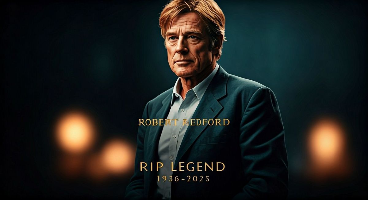 A movie poster design honoring Robert Redford, with bold lettering and dates. Features a cinematic fade-out effect in deep blues and gold accents, evoking a vintage Hollywood legacy.