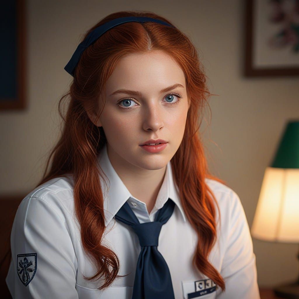 This image shows a hyper-realistic portrait of a young woman with striking blue eyes and long red hair, set against a warm, dimly lit background with subtle bokeh and a nostalgic sepia tone. The subject's skin and uniform are rendered in exquisite detail, with a focus on natural imperfections and rich, m...