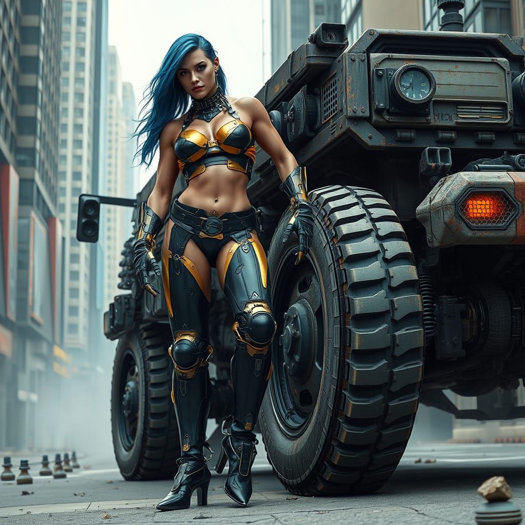 A powerful cyborg woman with blue hair poses in a dystopian cityscape. The image showcases a hyper-realistic, photorealistic style, reminiscent of cinematic sci-fi aesthetics, with a cyberpunk aesthetic.