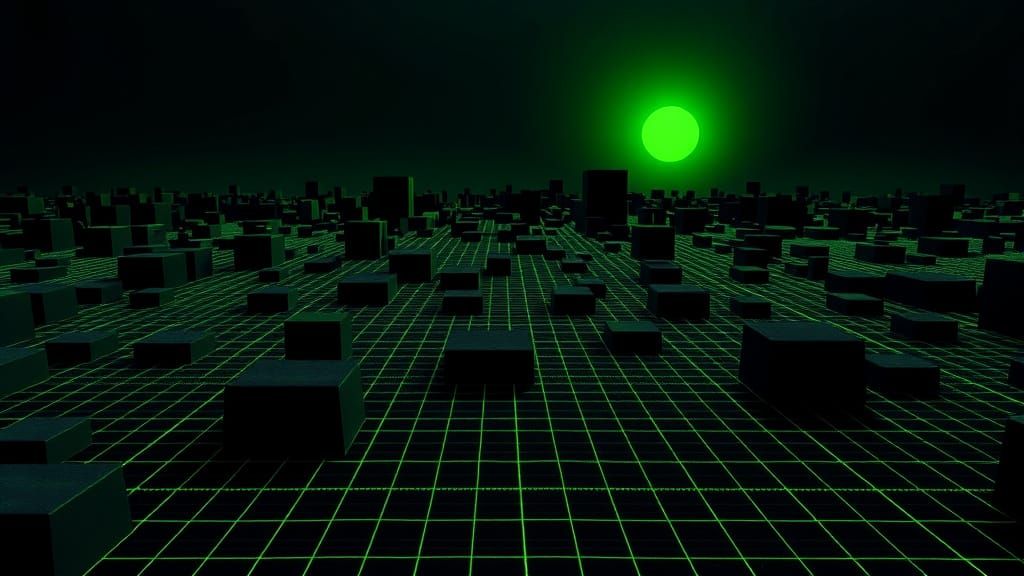 This image shows a low poly 3D rendering of a vast, dark landscape covered in a green laser grid, with black blocks rising up from the ground and a setting green sun in the black sky.