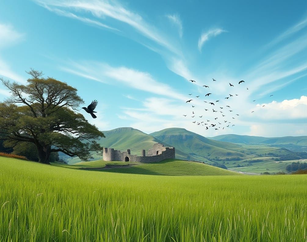 A digitally rendered landscape of a grassy meadow with hills in the background. The artwork, reminiscent of impasto style, features a palette of white and dark blue, depicting woods and a flock of crows under a light blue sky.