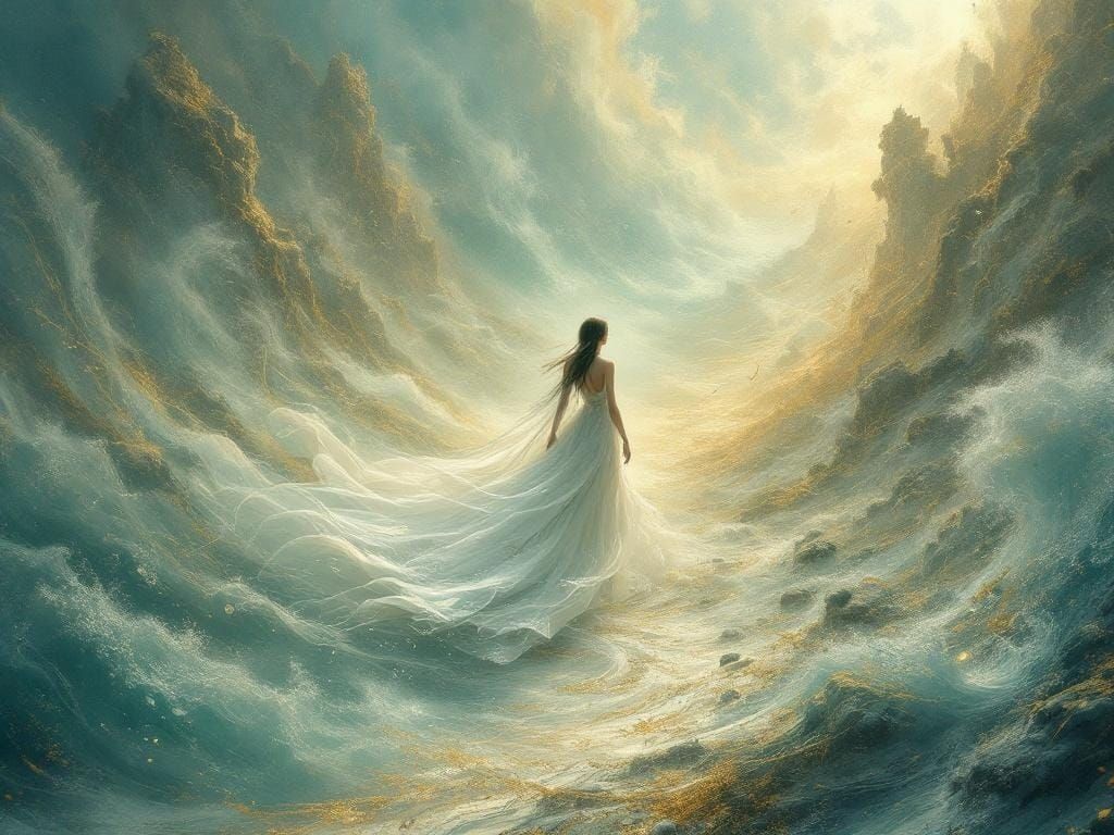 A figure in white stands in a windy landscape with teal and gold colors. The image evokes a whimsical atmosphere and intricate textures, reminiscent of fantasy art.