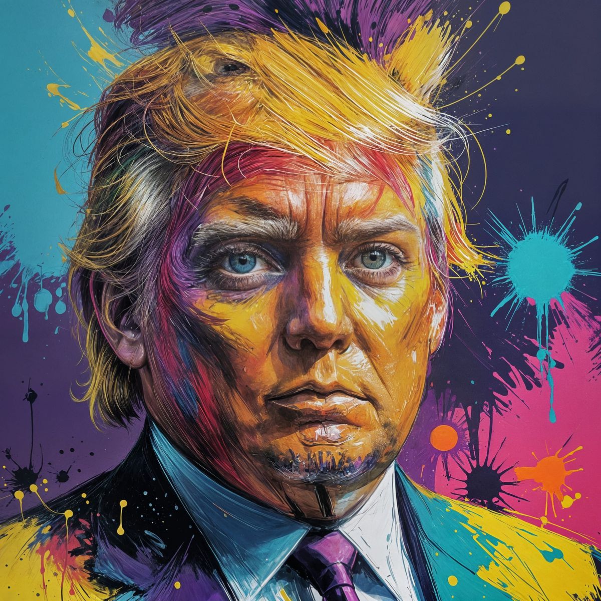This image showcases a vibrant pop art painting of Donald Trump's face. It features bright, bold colors and dynamic paint splashes, with striking golden-yellow eyes as a focal point. The style is modern and energetic.