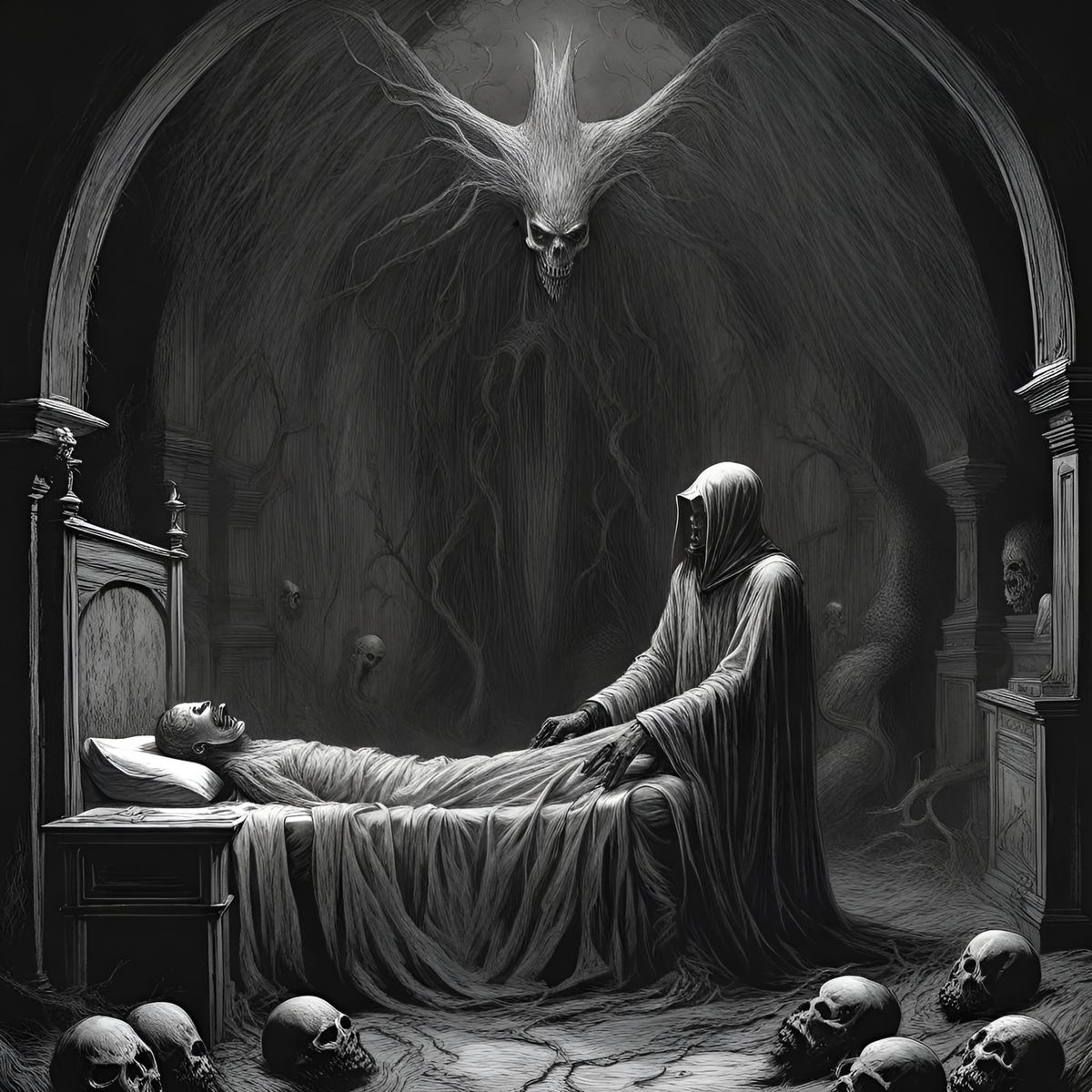 This image shows a tortured man's nightmare dream of death. The black and white image evokes a horror aesthetic with intricate details and a monochromatic palette.