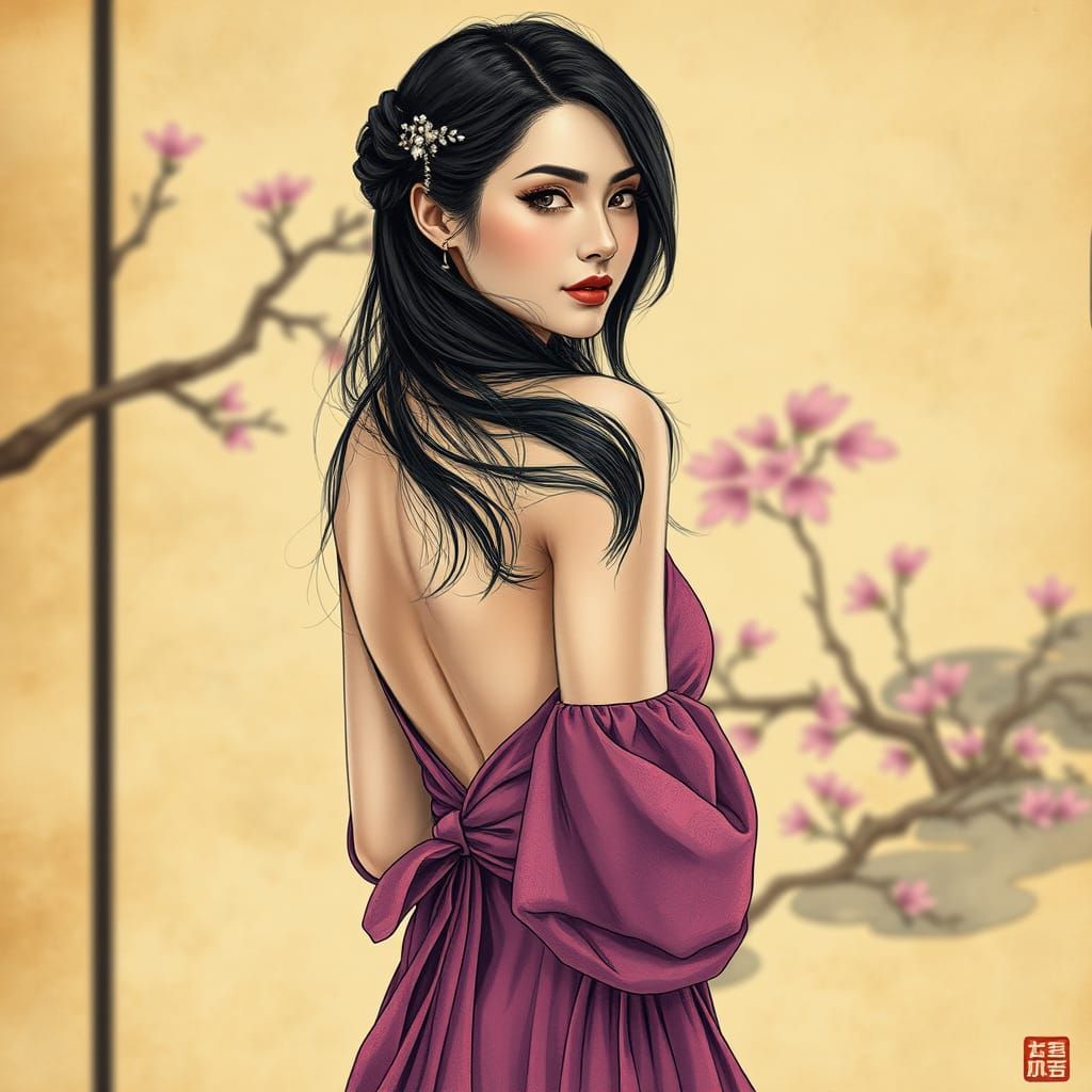 A delicate black ink drawing on aged rice paper portrays a beautiful caucassian woman in a flowing designer dress. From a three-quarter back view, she gracefully turns her head, her long dark hair cascading over one shoulder and her gaze meeting the viewer with a seductive gaze, her expression suggestive. ...