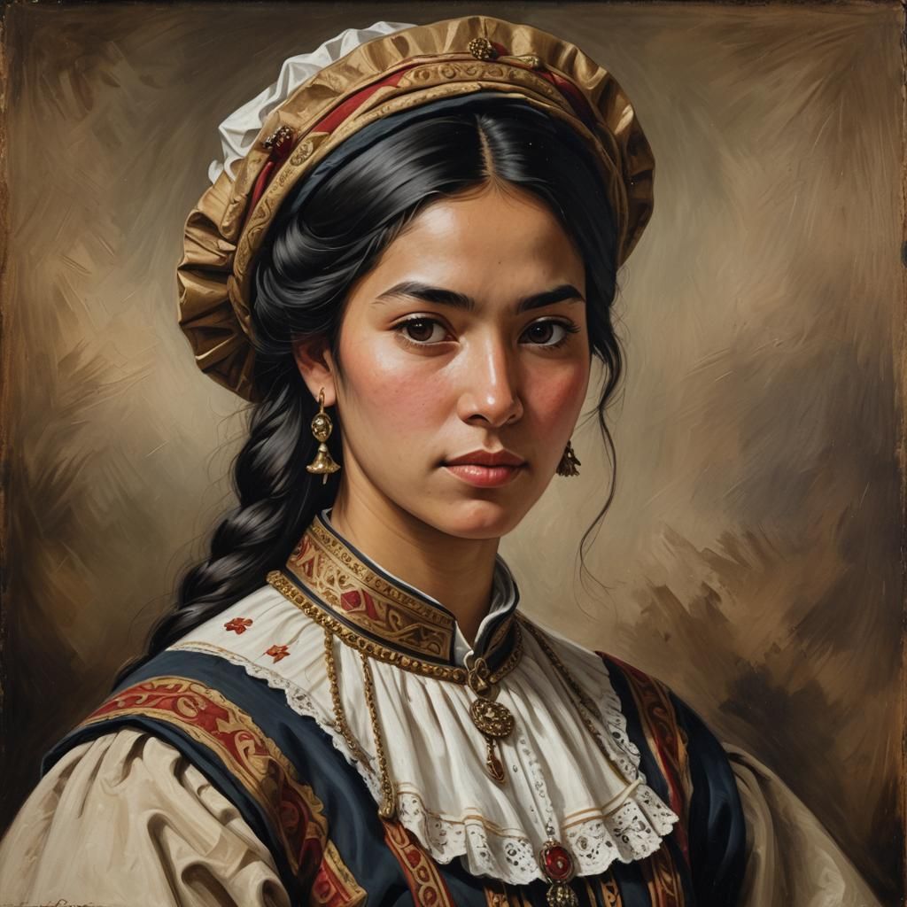 A photorealistic oil painting of a young Chilean woman in traditional dress. Earth tones and golden highlights accentuate the subject, with the Andes mountains and Valdivia architecture in the background.