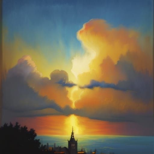 A vibrant gouache painting of a golden sun over a blue sea. The image is rendered with thick brushstrokes and watercolor textures, evoking an impressionist style with warm light.