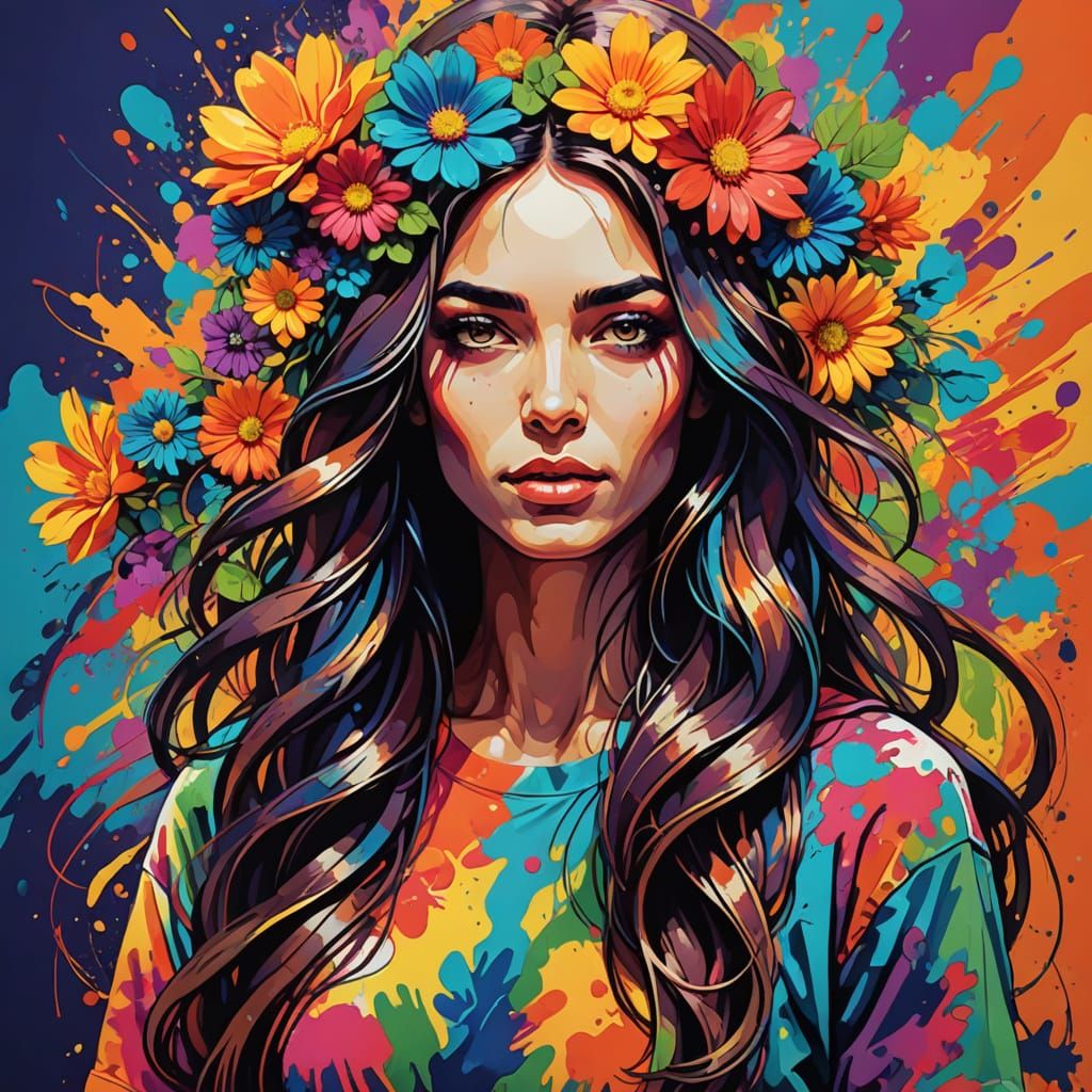 A vibrant and dreamlike portrait of a woman with long hair, surrounded by swirling patterns of flowers and rainbow colors, in a warm and textured Pop Art style.