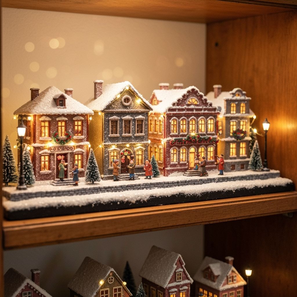 This image shows a detailed miniature Christmas scene from Minsk on a vintage shelf. Tiny buildings with lights and figures create a warm, nostalgic holiday atmosphere in a diorama style with soft lighting.