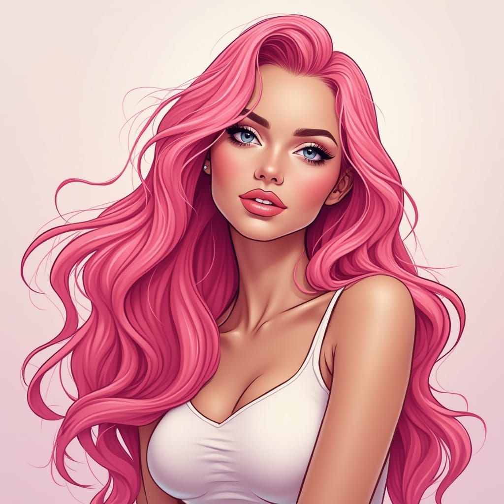 This image shows a woman with long, vibrant pink hair in a striking portrait. Rendered in a modern comic book illustration style with bold lines and studio lighting.