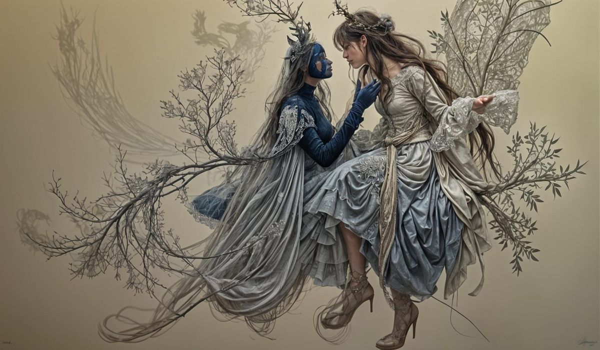 This image shows a surreal noir scene with masked figures in conversation at a winter after-party. The intricate snow city background is rendered in a dreamlike, hypertextured style with graceful gradients.