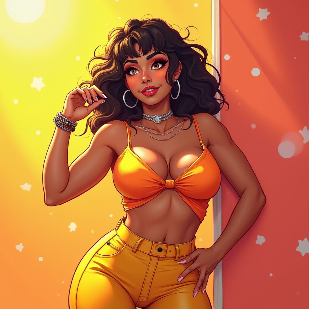 This image features a vibrant, confident woman with a curvy figure posing playfully in a trendy outfit. The background is warm and sunny, with a shallow depth of field, evoking a lively and dynamic aesthetic.