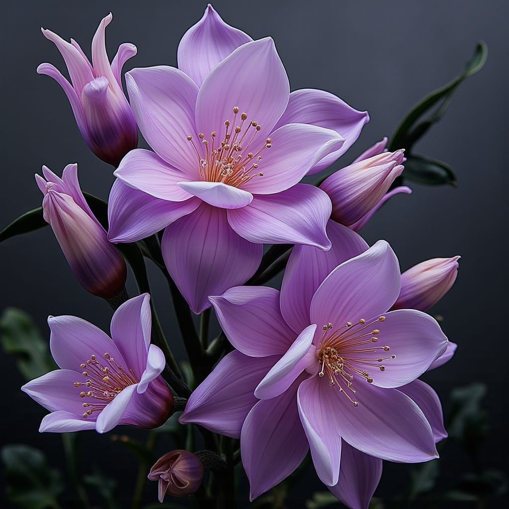 This image showcases delicate stucco artwork flowers in soft lavender and antique pink hues. Featuring intricate details and HDR, it is beautifully shot with a sharp focus and atmospheric mood.