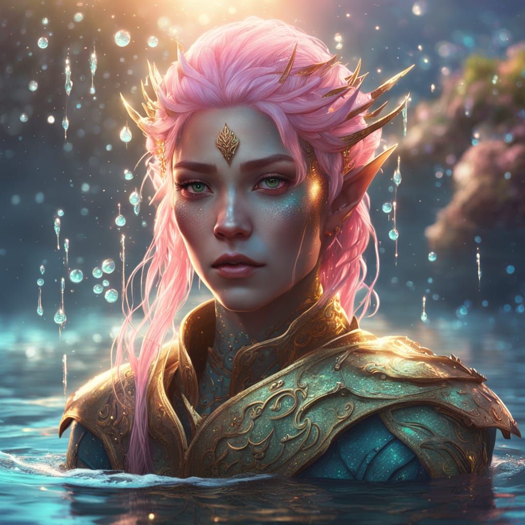 A vibrant digital artwork of a sea elf woman ranger in water. The close-up shot features shimmering water droplets and glitter on her pink hair in a pastel color palette.