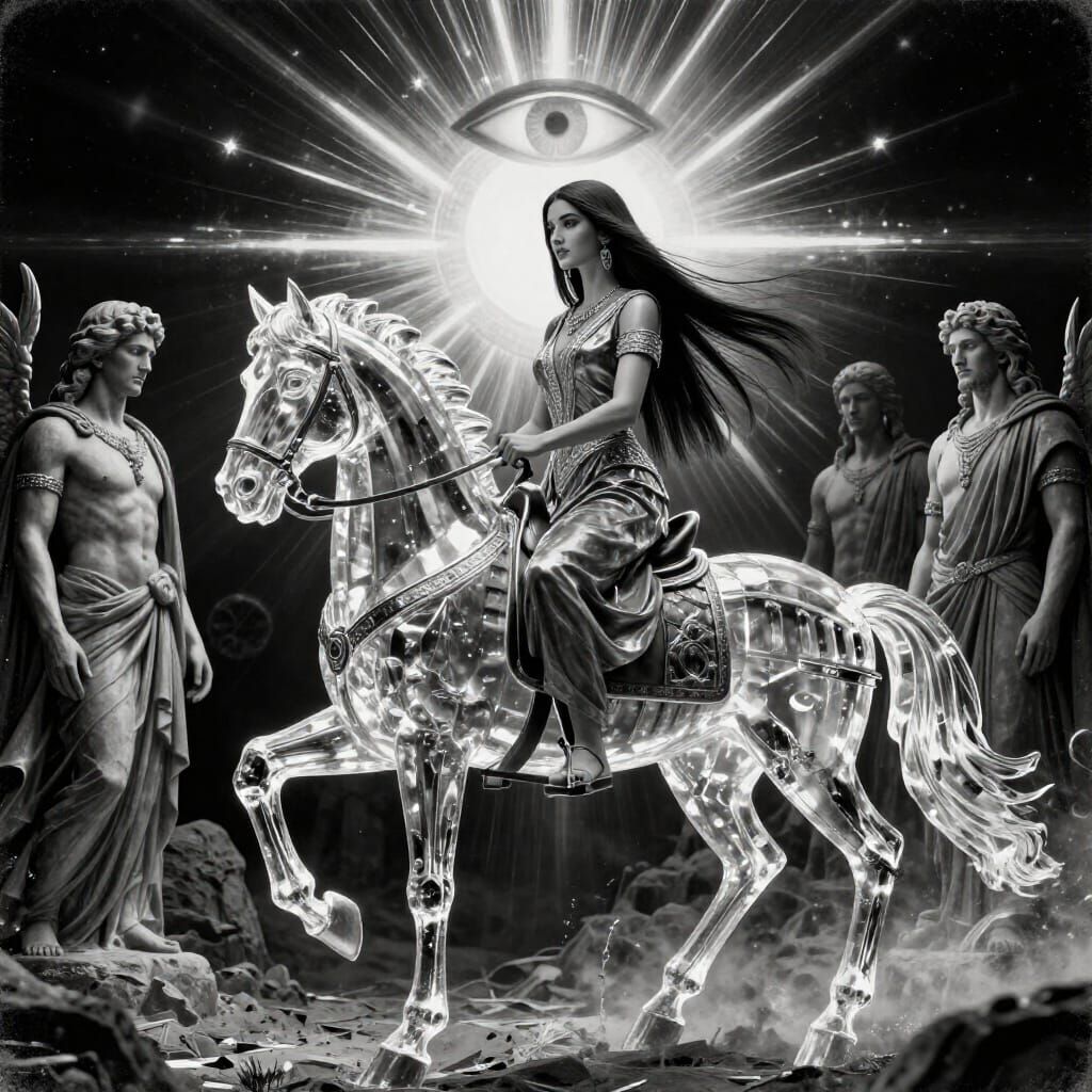 michelangelo painting style, statues guys around, beautiful armenian woman with ultra straight hair, very connected spiritual, riding crystal horse in the epic road of city of shamballah in background with third eye, ray of lights between characters, ultra deep contrast, ROMA, monochromatic bad argentic ...