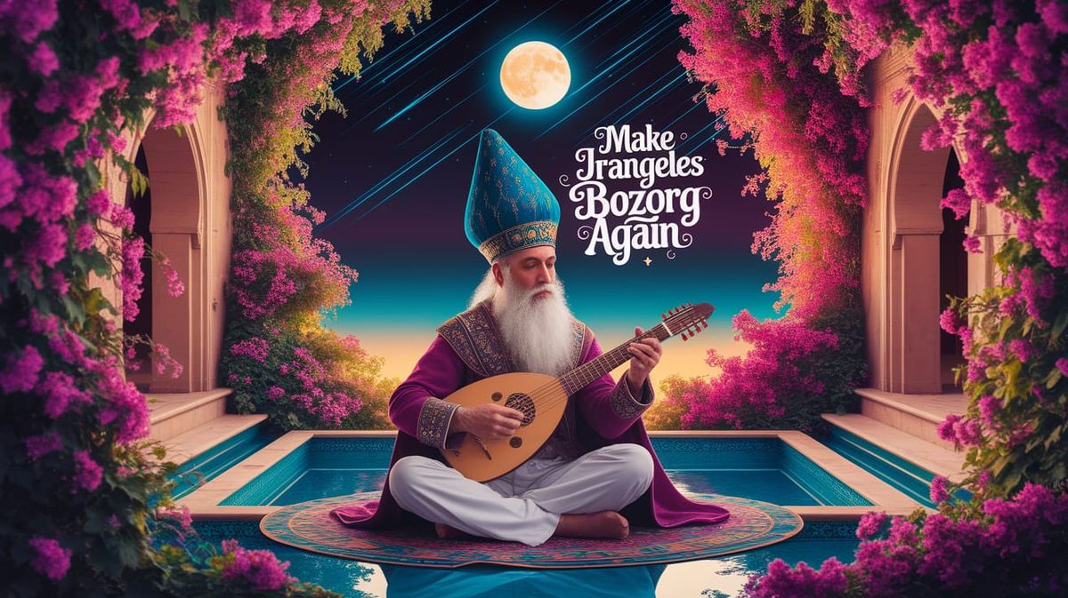 This AI-generated image captures a vizir playing a lute in a lush Persian garden, rendered in vibrant psychedelic Qajar art with groovy, fluorescent colors and a tranquil vibe.