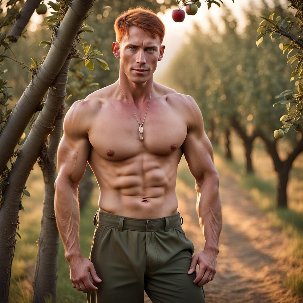A heartwarming image shows a soldier returning home through an apple orchard. He is shirtless, wearing army pants and a backpack, approaching a small pink house in the dawn light.