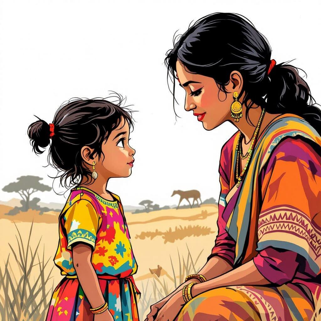 This image shows a white girl curiously questioning her Indian teacher. The setting evokes an African safari, rendered in a sketch style with bold outlines and minimal background detail.