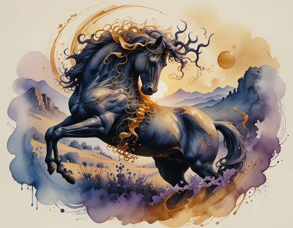 This captivating watercolor artwork features a centaur's upper body merging with a twilight landscape, its eyes glowing with an ethereal light. The scene is set amidst a soothing palette of indigo, blue, and violet hues, reminiscent of Roberto Ferri's style, with macro details and minimalist flair.