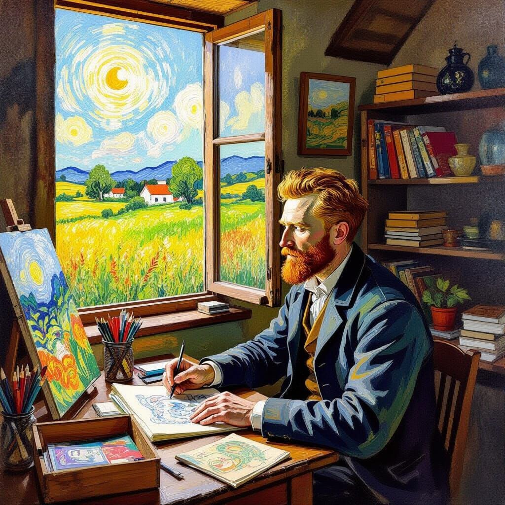 A vibrant watercolor painting of Van Gogh in his studio, surrounded by Faber-Castell pencils and art. A green landscape visible through the window symbolizes sustainability and SDGs, in an environmental psychology style.