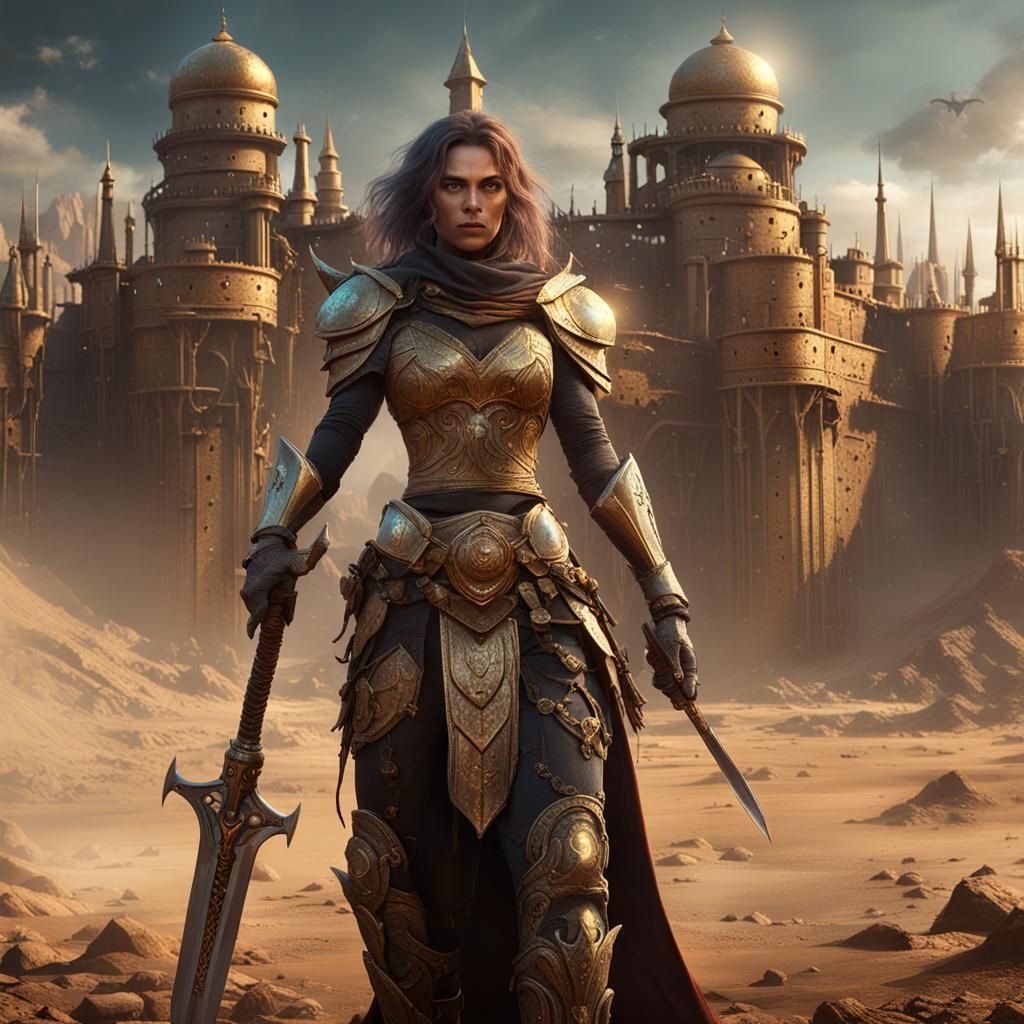 A digital painting shows Taarna, a formidable warrior with a golden sword, advancing towards a dark castle in a desolate landscape. The image features rich colors and intricate details.