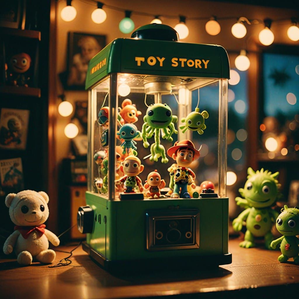 This nostalgic image captures a vintage claw machine filled with action figures and aliens in a dimly lit room, with a soft focus and warm, muted tones reminiscent of old-film photography from the '70s and '80s.
