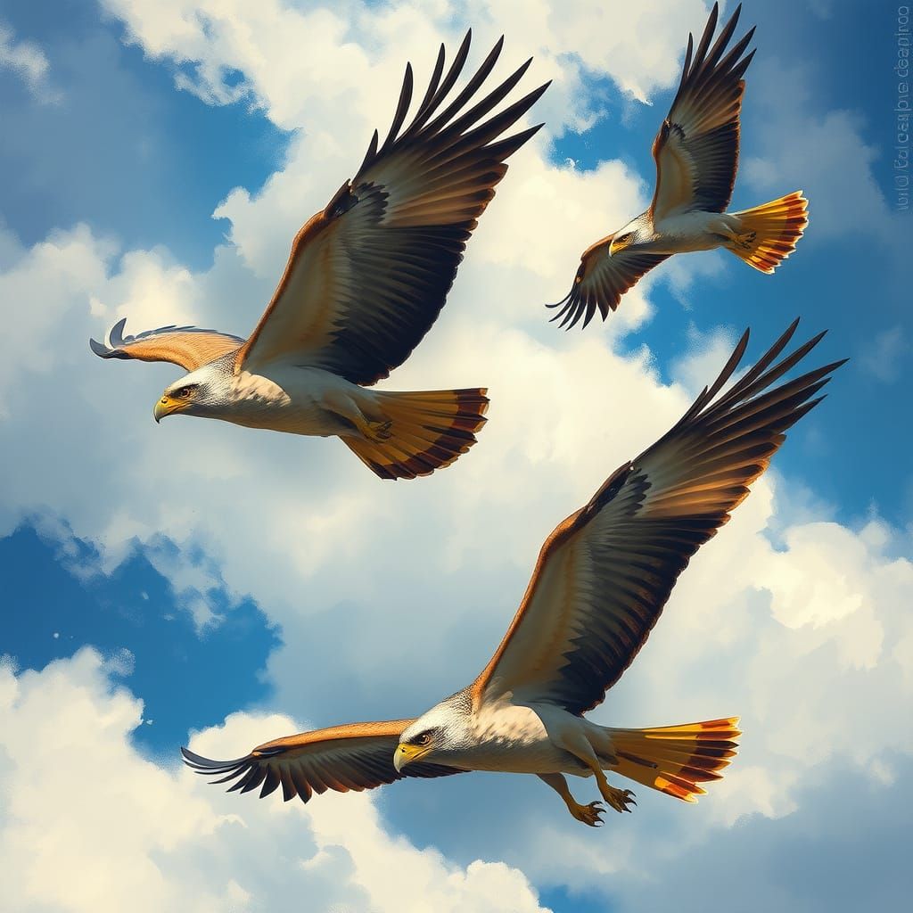 A vivid image of birds of prey soaring in a dramatic sky. The artwork emphasizes intricate feather details and vibrant colors with expressive brushstrokes in a dynamic digital painting style.