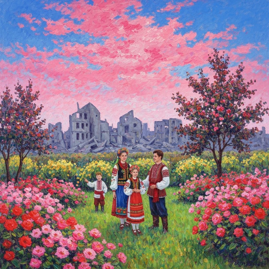 This image shows a Ukrainian family in traditional clothing, amidst a colorful flower garden. The background reveals a war-torn cityscape under a vibrant pink and blue sky, reminiscent of impressionist paintings.
