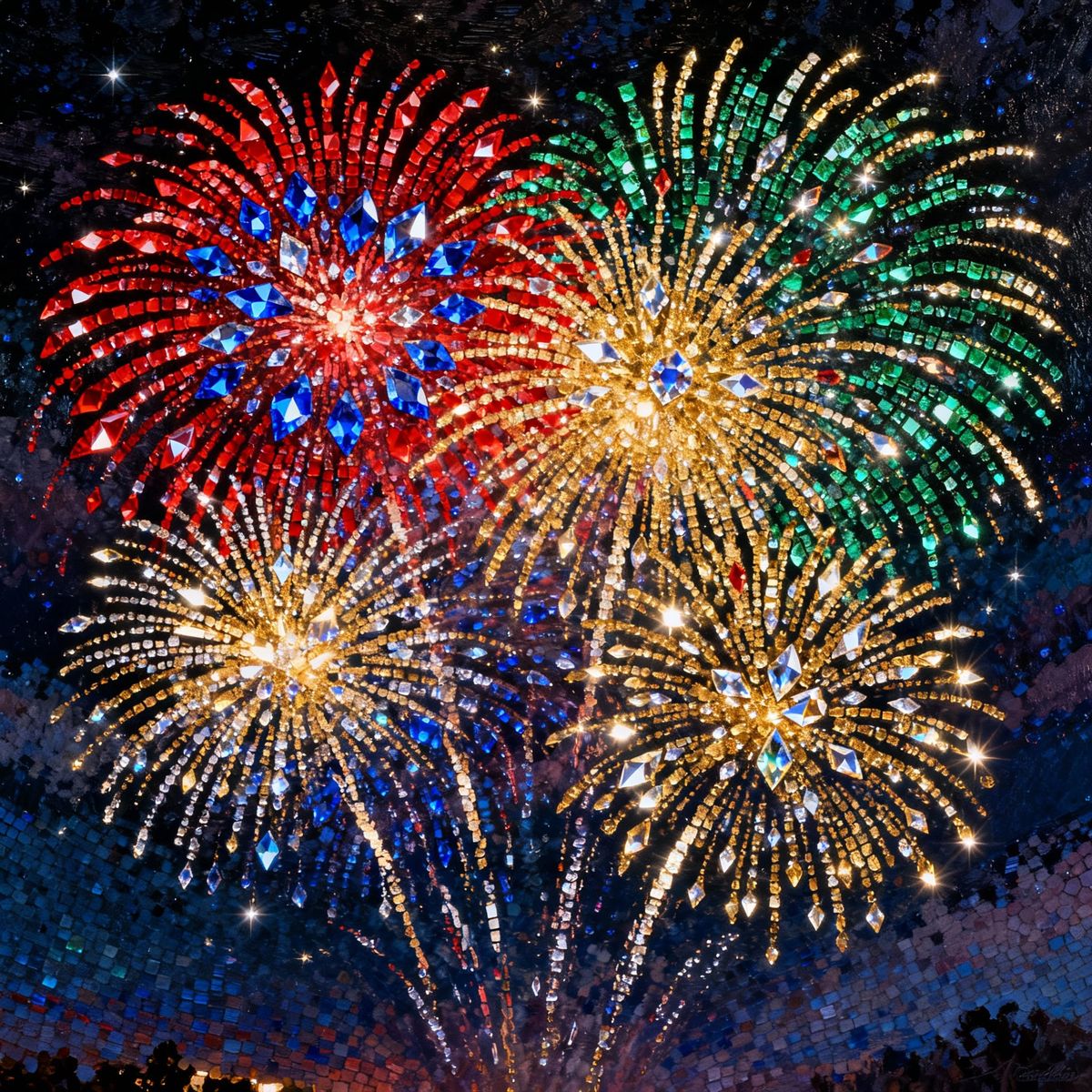 This image showcases a dazzling fireworks display in a night sky, rendered with the intricate, sparkling facets and jewel tones characteristic of diamond painting art. Vibrant colors burst like gemstones.