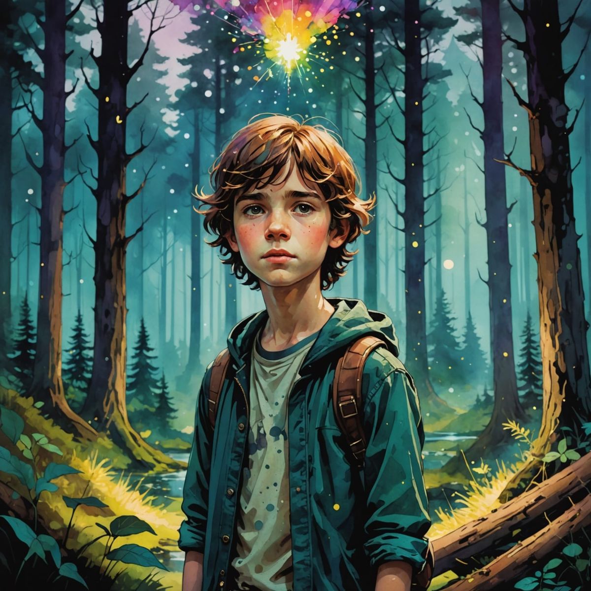 A colorful portrait of a boy in a forest with floating sparks. This artwork combines watercolor and ink techniques with a solarpunk aesthetic.