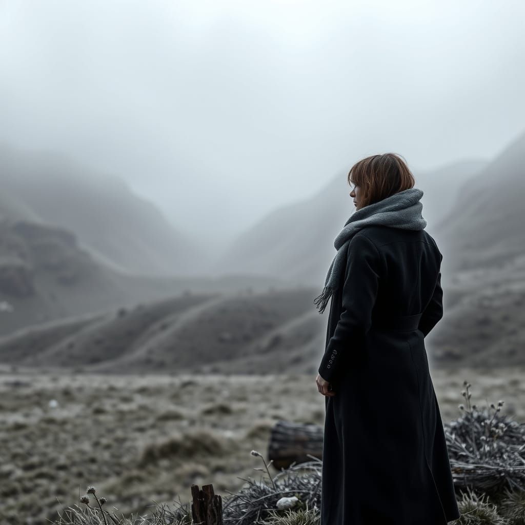 A solitary figure contemplates a misty moor landscape. The image captures the scene with soft focus and desaturated tones, in a cinematic style reminiscent of classic monochrome photography.