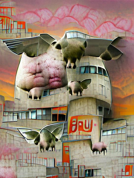 This image features an unsettling, winged pig rendered in a brutalist and surreal style. The artwork conveys a sense of discomfort and distorted reality through its unconventional depiction.