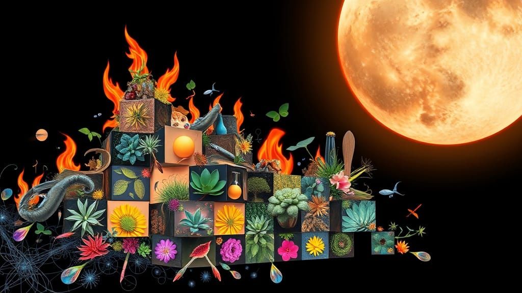 A stunning digital artwork featuring a woman composed of hyperdetailed kitchen tools in various colors and sizes, set against a black and white background of fire shapes, surrounded by micro plants in each cube, conveying a sense of connection with nature and the cosmos.