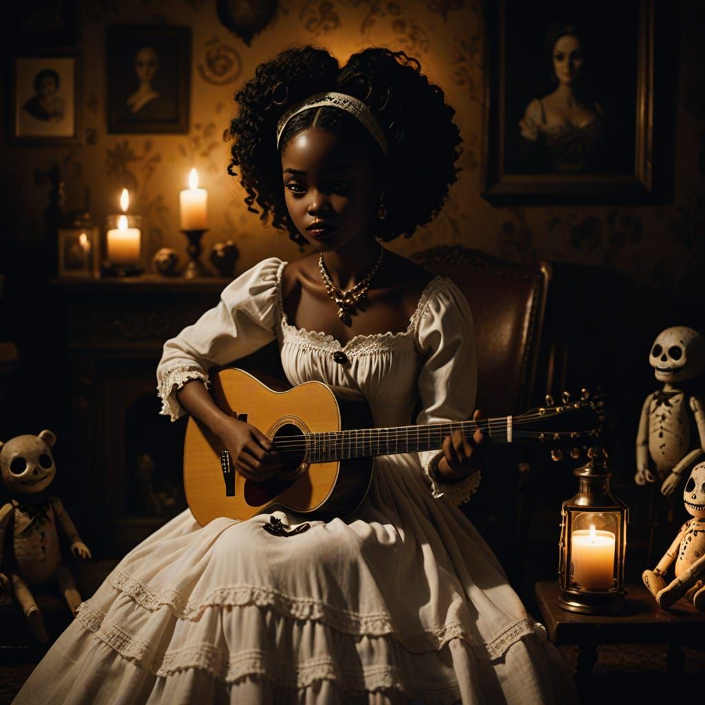 This haunting image captures a woman in a dimly lit room, surrounded by eerie voodoo dolls, as she strums a guitar under the warm glow of flickering candles, evoking a mystical, suspenseful atmosphere reminiscent of film noir