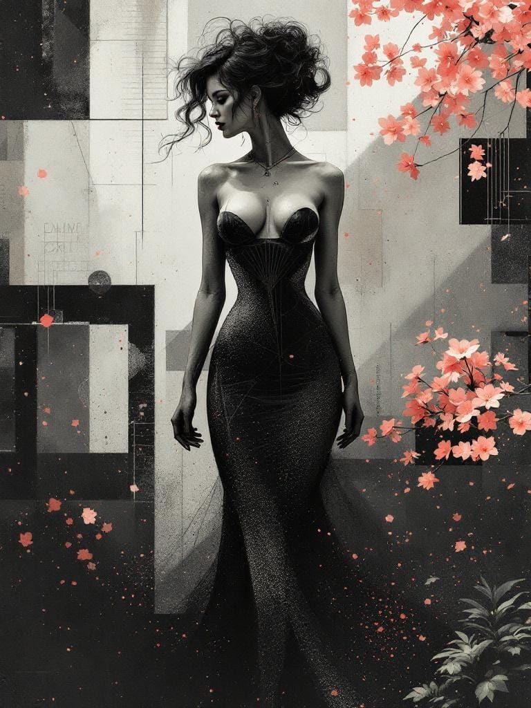 This image shows a fusion of abstract geometric patterns with a vintage pin-up figure in a retro garden scene. Atmospheric shadows create depth through tonal modeling and textural patterns in a charcoal pointillism style.