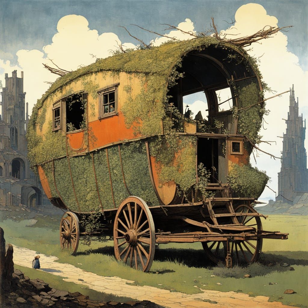 Design your own unique nomad caravan or overgrown ruin images for free with our easy AI art generator.