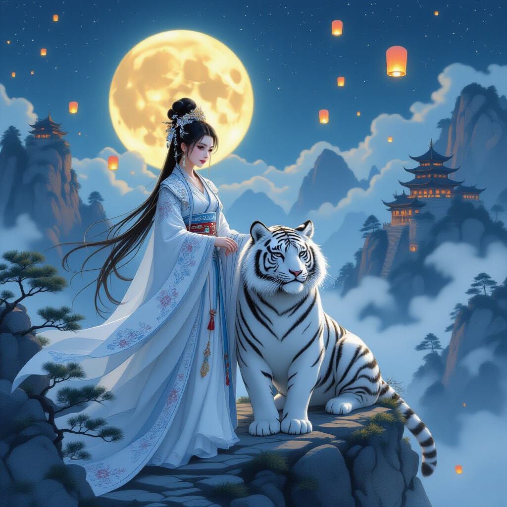 This image shows a princess in silver hanfu standing with her white tiger on a misty mountain. Ancient ruins and paper lanterns add to the whimsical, fantasy atmosphere. The art style blends traditional Chinese elements.