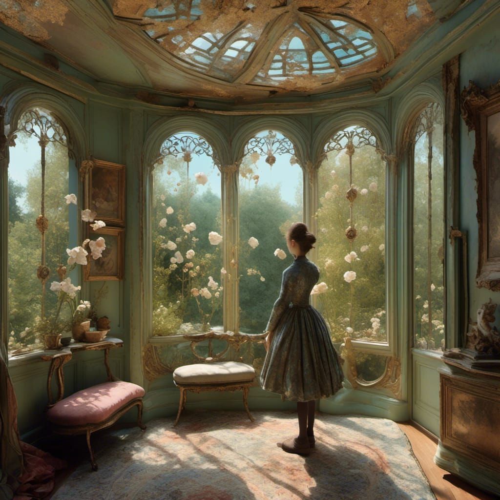 A 3D render of a dreamer gazing out a window. The image evokes a Victorian oriental aesthetic with sharp details and focus, reminiscent of impressionist paintings.