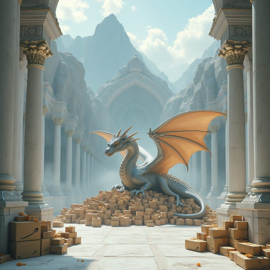 This image depicts a serene white marble temple in the misty mountains, adorned with intricate carvings, statues, and silver braziers. A magnificent winged dragon reclines amidst a treasure hoard, surrounded by scattered boxes in a hyper-realistic style reminiscent of Syd Mead's concept art.