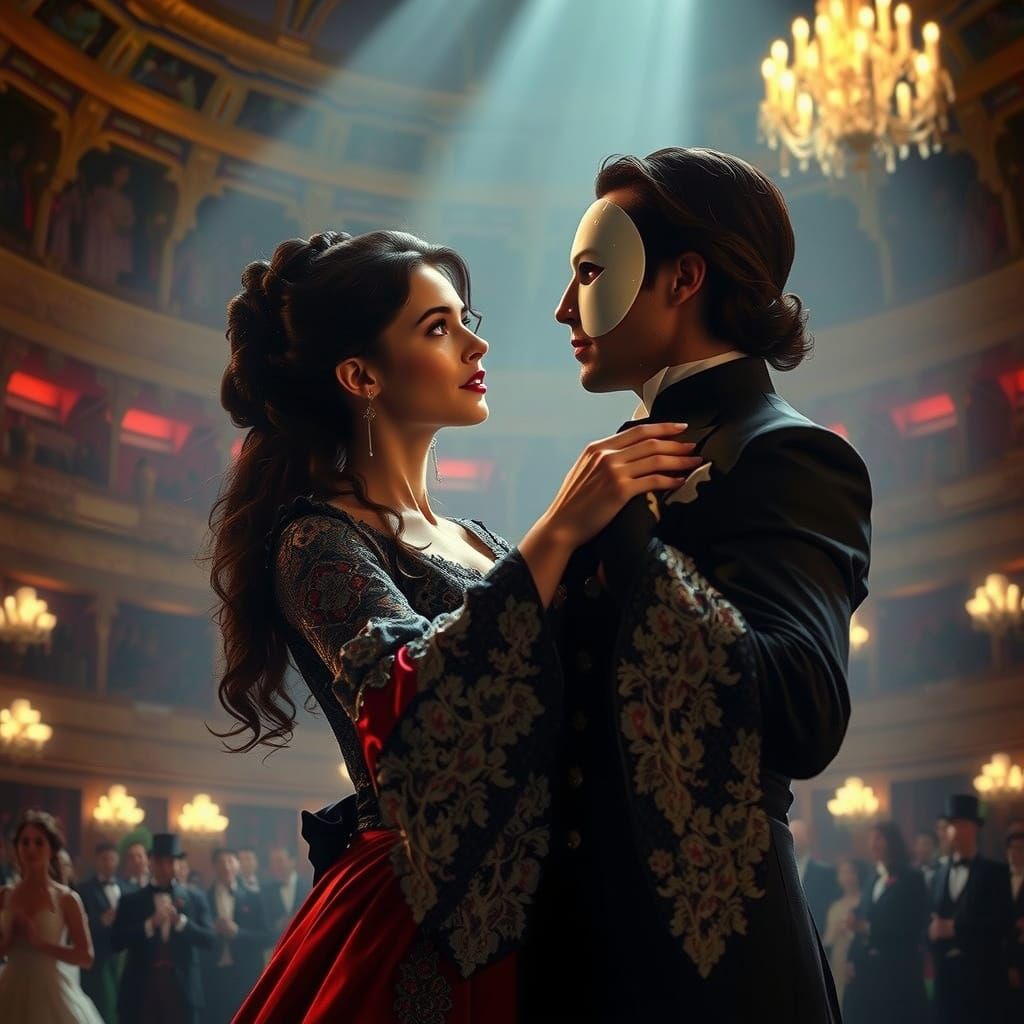 This image captures a dramatic moment between Christine and the Phantom, set against the grand backdrop of a 19th-century opera house. Christine wears a stunning Victorian-inspired gown with intricate lace, while the Phantom sports a small white half-mask, exuding mystery and longing.