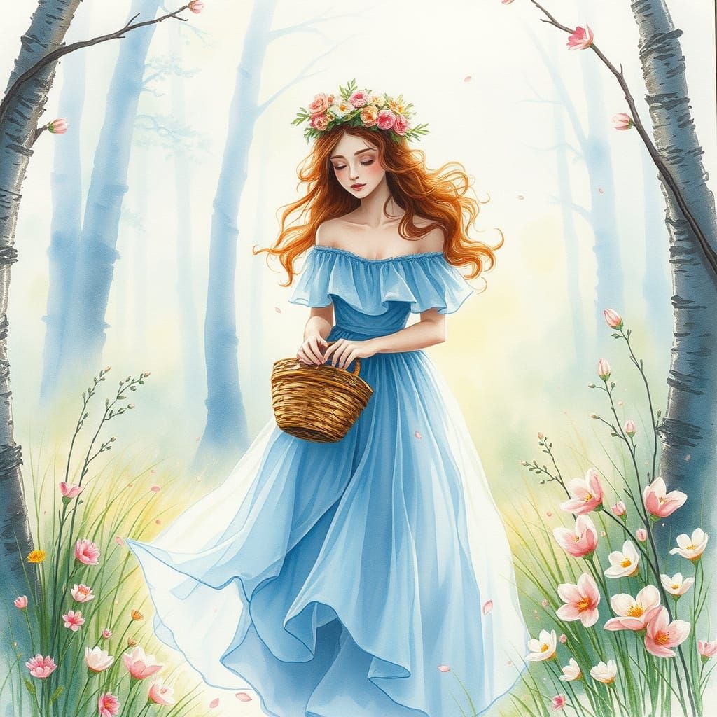 This image showcases a serene, watercolor-inspired scene of a woman strolling through a vibrant forest, surrounded by blooming flowers and lush greenery, set against a soft, dreamy light