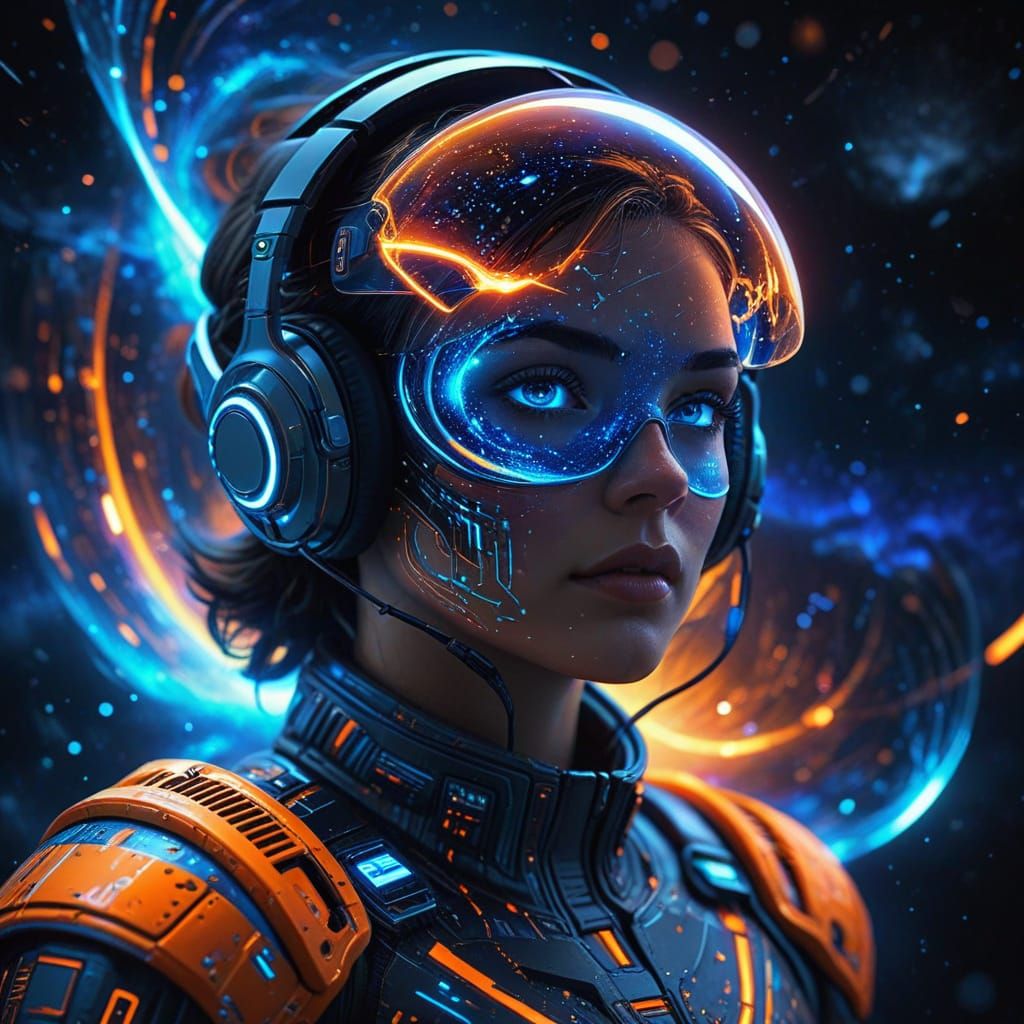 This vibrant digital art piece captures a person floating in a starry expanse, surrounded by neon-lit circuitry and glowing accents, set against a backdrop of whizzing planets and a warm orange glow.