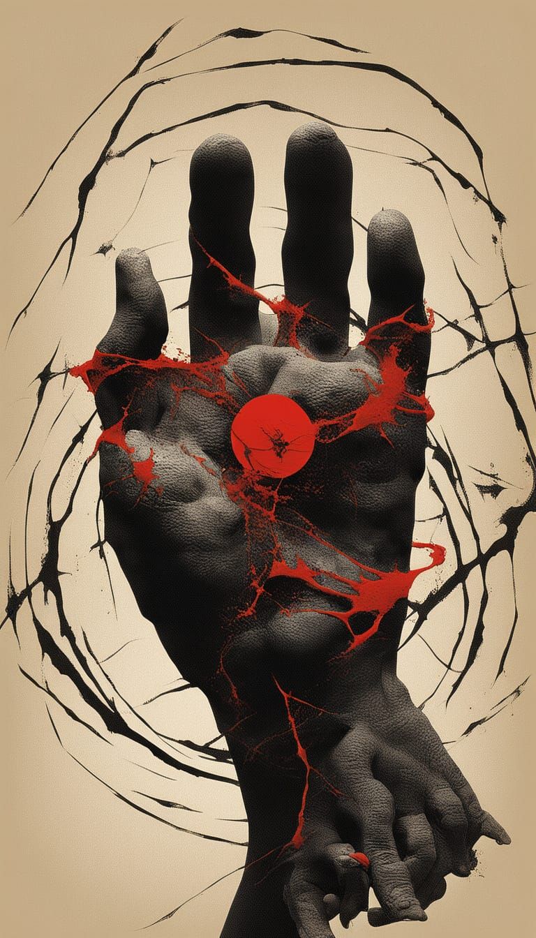 This image shows a clenched fist amidst a scene of horror and mystery. The artwork combines elements of zombiecore with the sleekness of Cinema 4D and the repaired aesthetic of kintsugi.