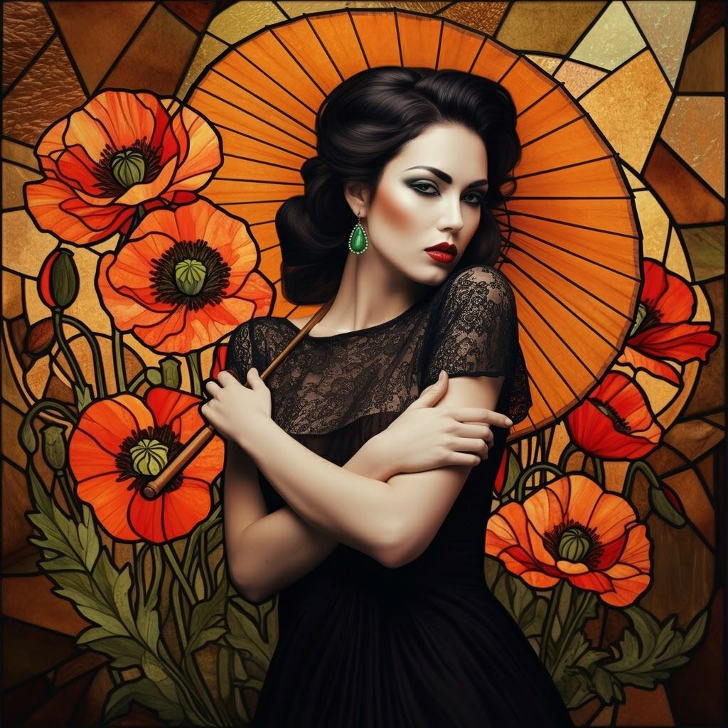 A photorealistic portrait of an elegant woman with striking features, dark hair, and red lipstick, set against a stained-glass background with vibrant poppies and an orange umbrella, in a surreal art style.