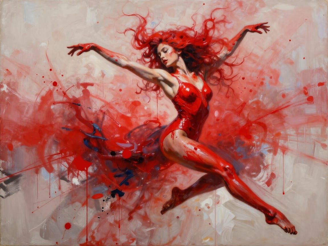This image showcases a photorealistic expressionist painting of a woman in a red leotard, mid-leap, with red body paint dripping. Dynamic movement and abstract elements define the artwork.