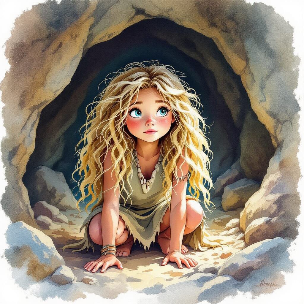 A prehistoric girl with messy blonde hair is depicted inside a cave in a soft watercolor style.
