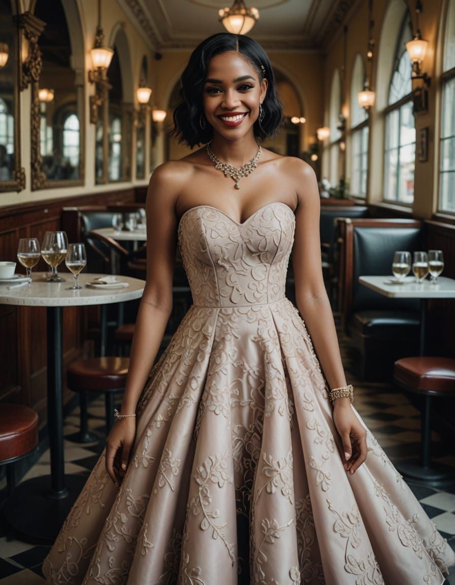 This image shows a full-body portrait of a smiling 22-year-old Dominican woman in a strapless gothic dress. The digital photo features soft lighting and pastel colors.
