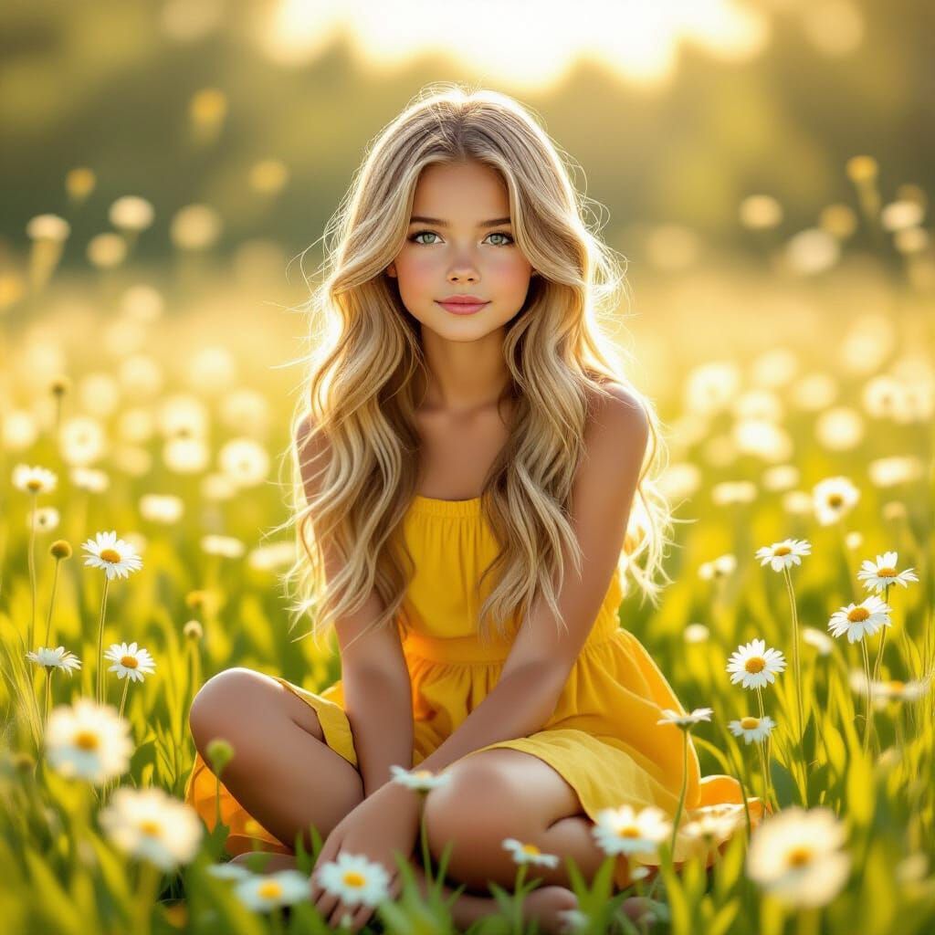 A photorealistic colored pencil drawing of a blonde girl in a yellow dress sitting in a field of daisies. Warm sunlight illuminates her, with intricate details and a blurred background.