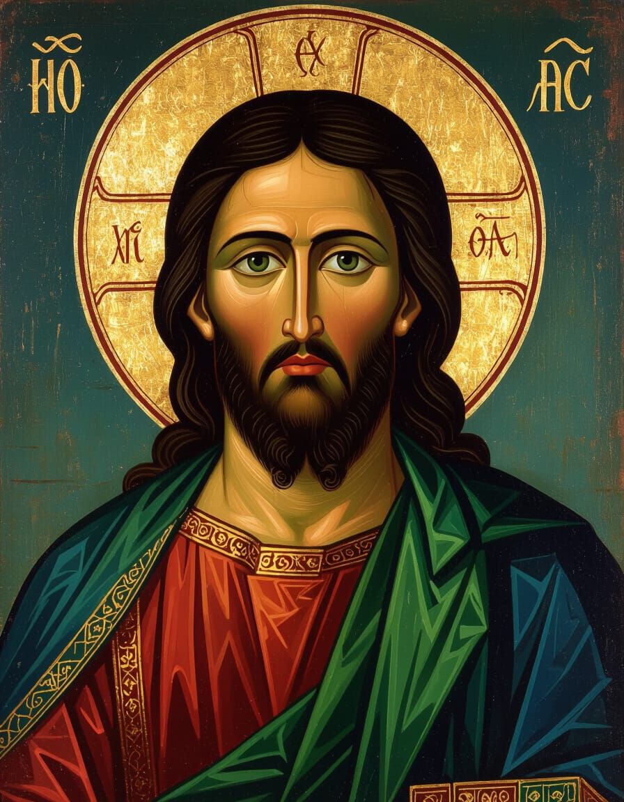 An old orthodox icon of Jesus Christ with olive skin, green eyes, and black hair, wearing blue and red. Rendered in a Byzantine art style with gilded halo and divine lighting.