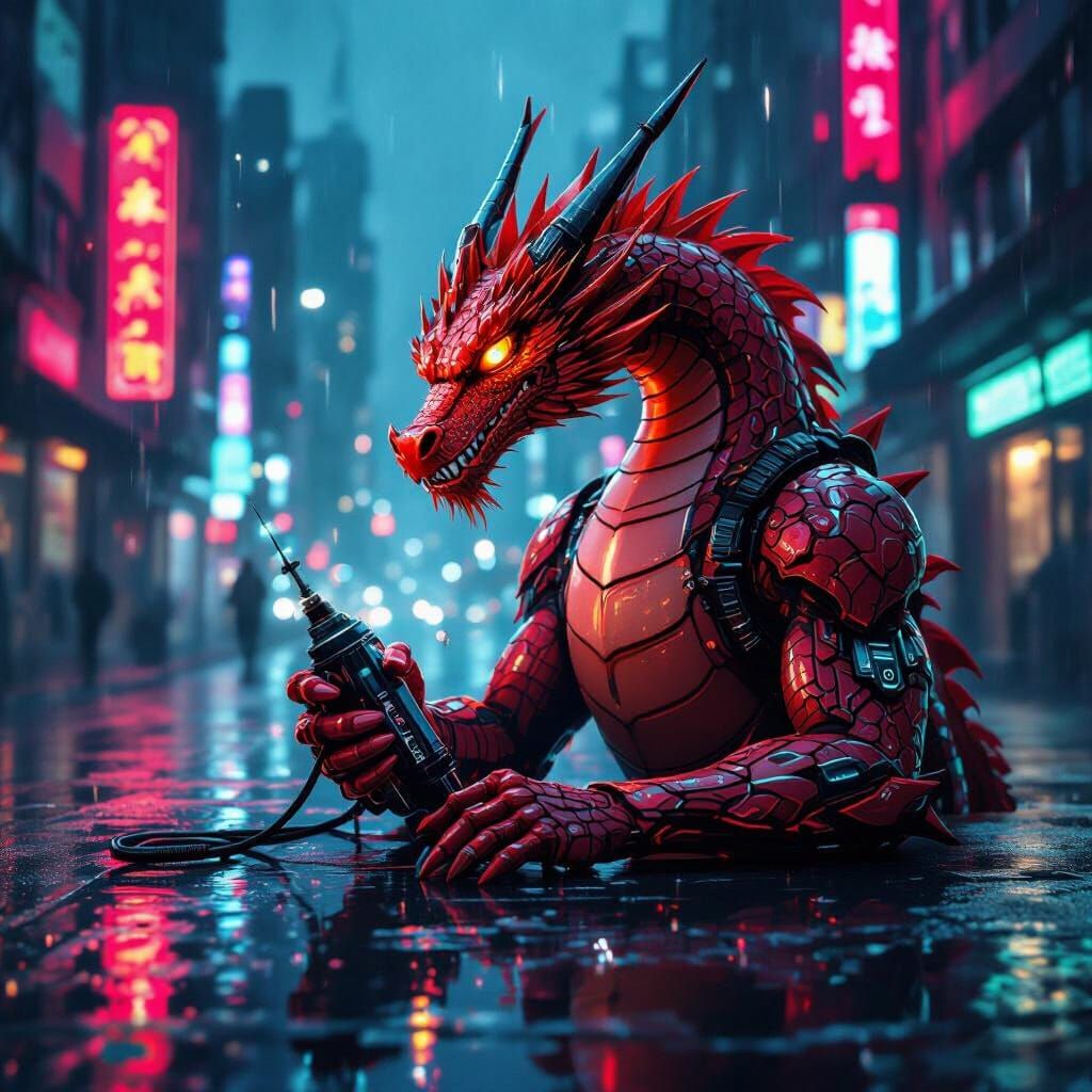 A red dragon holds a tattoo machine against a cyberpunk cityscape backdrop. Neon lights reflect off the wet pavement, creating a high-tech, dark, and rainy atmosphere in a futuristic style.
